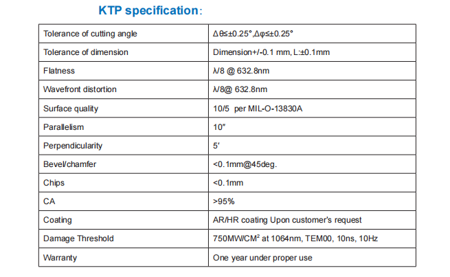 KTP crystals is the most commonly used material for frequency doubling of Nd-doped lasers, particularly at the low or medium power density.It is widely used for frequency mixing to generate Red/Green/Blue output, and for OPO and OPA to generate visible to mid-infrared tunable output. It is also used for many E-O devices such as Q-switches and E-O modulators.
